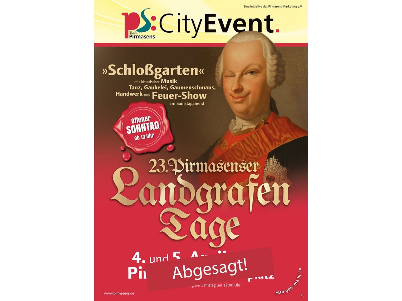 Die für das erste April-Wochenende geplanten Landgrafentage finden nicht statt. Der Verkaufsoffene Sonntag wird auf 5. Juli verschoben. Damit reagiert die Stadtverwaltung Pirmasens als Veranstalter auf die verstärkte und beschleunigte Verbreitung des Coronavirus (COVID-19).