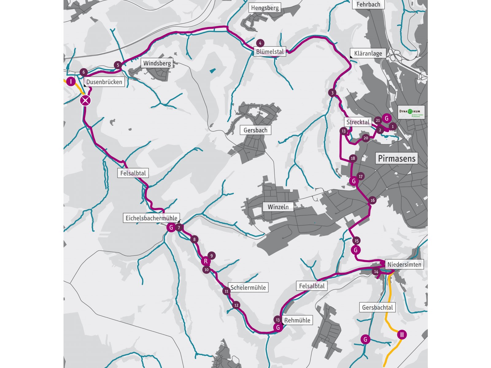 Start und Ziel ist das Rheinberger Gebäude in dem sich das 1. rheinlandpfälzische Science Center Dynamikum befindet. Von hier aus fahren Sie den hervorragend ausgeschilderten Radweg durch das Strecktal, das nahtlos übergeht ins Blümelstal.