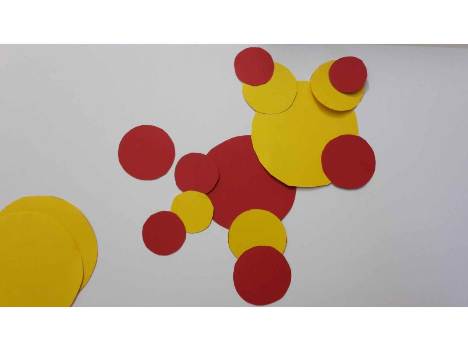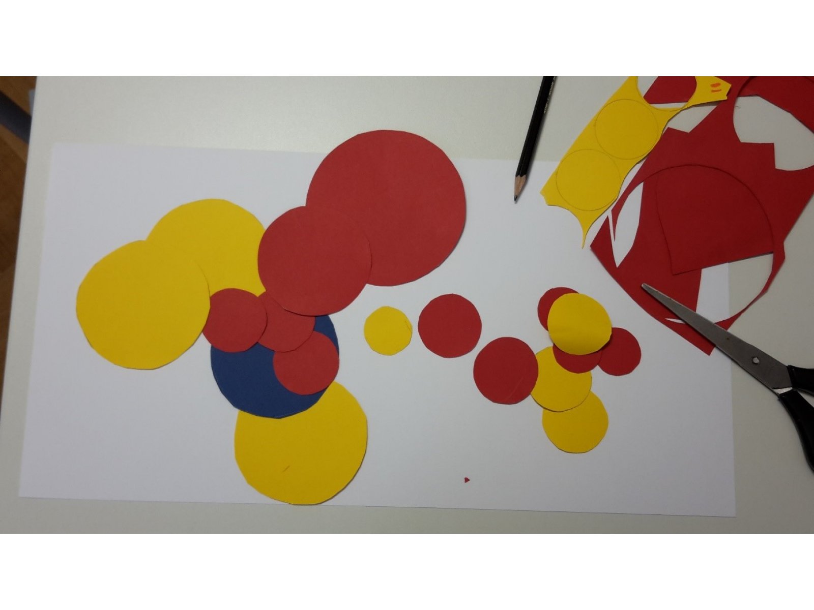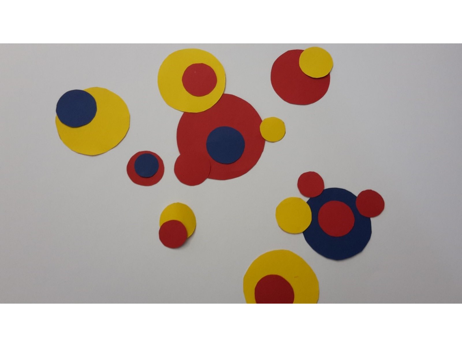 Papier mit jeweils einer Farbe, mindestens drei verschiedene (zum Beispiel Rot, Gelb, Blau etc.), eine Schere, einen Klebestift, einen Bleistift und Objekte, die eine Runde Form haben wie Tassen, Spitzer, Gläser etc.; drei oder vier Größen genügen.