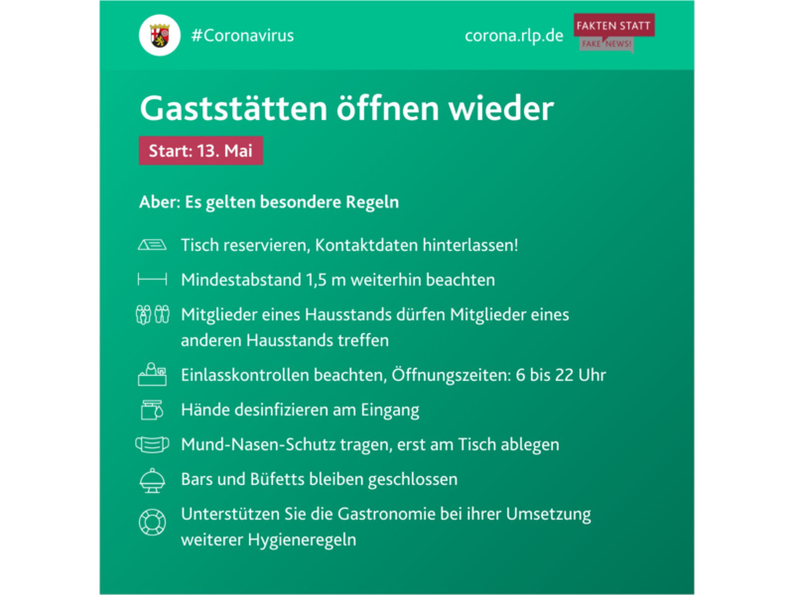 Die Gastronomie ist ab dem 13. Mai mit Auflagen und ohne Nutzung der Barbereiche geöffnet.