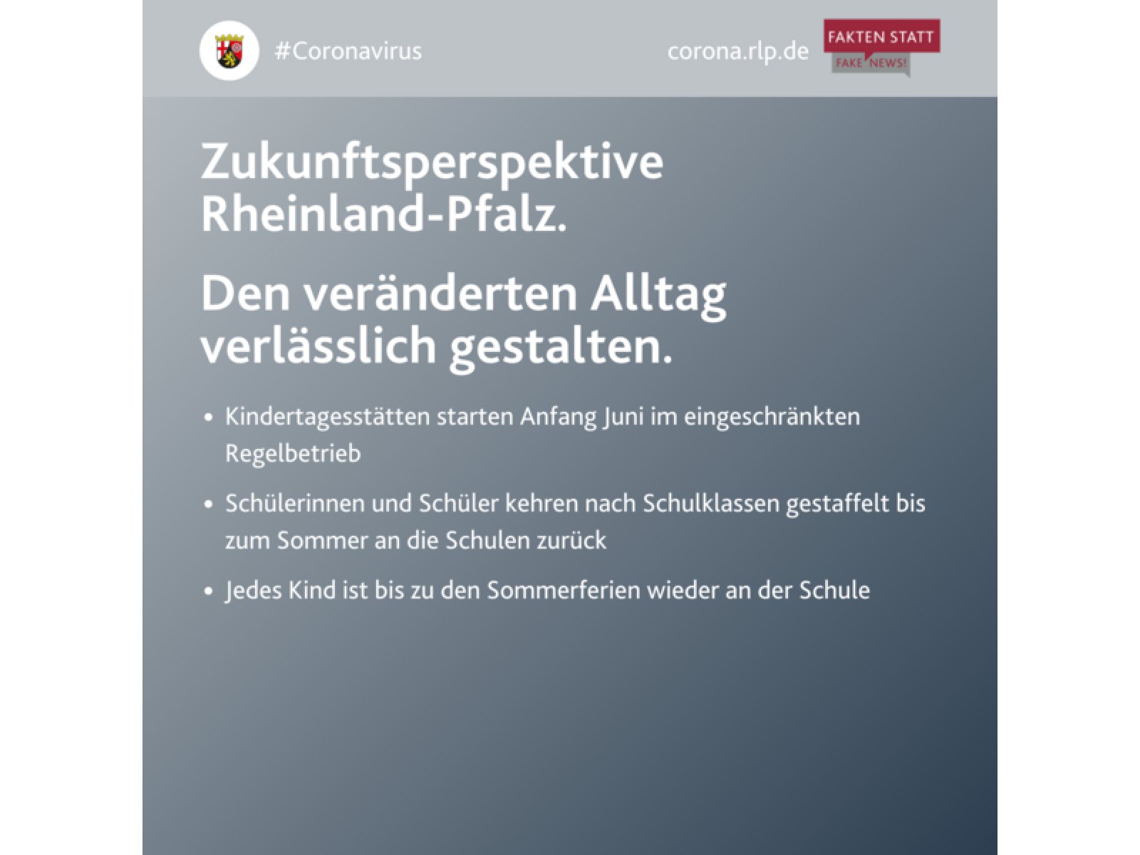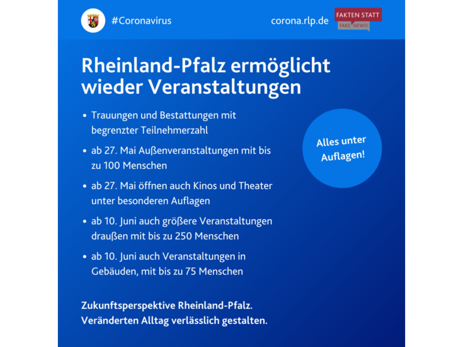 „Allen Lebens- und Geschäftsbereichen eine verlässliche Perspektive geben, den veränderten Alltag gestalten und dabei das Infektionsgeschehen kontrollieren, das ist Ziel der ‚Zukunftsperspektive Rheinland-Pfalz‘, die der Ministerrat verabschiedet hat. Das Konzept folgt dem Dreiklang „Gesundheit schützen – Freiheitsrechte bewahren – Wirtschaft stärken."