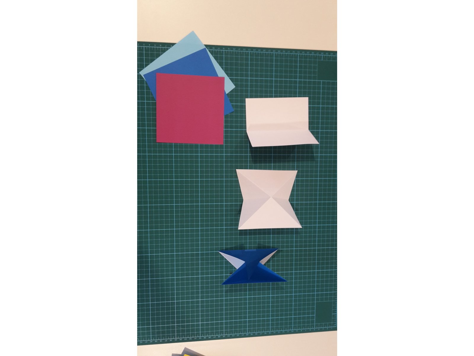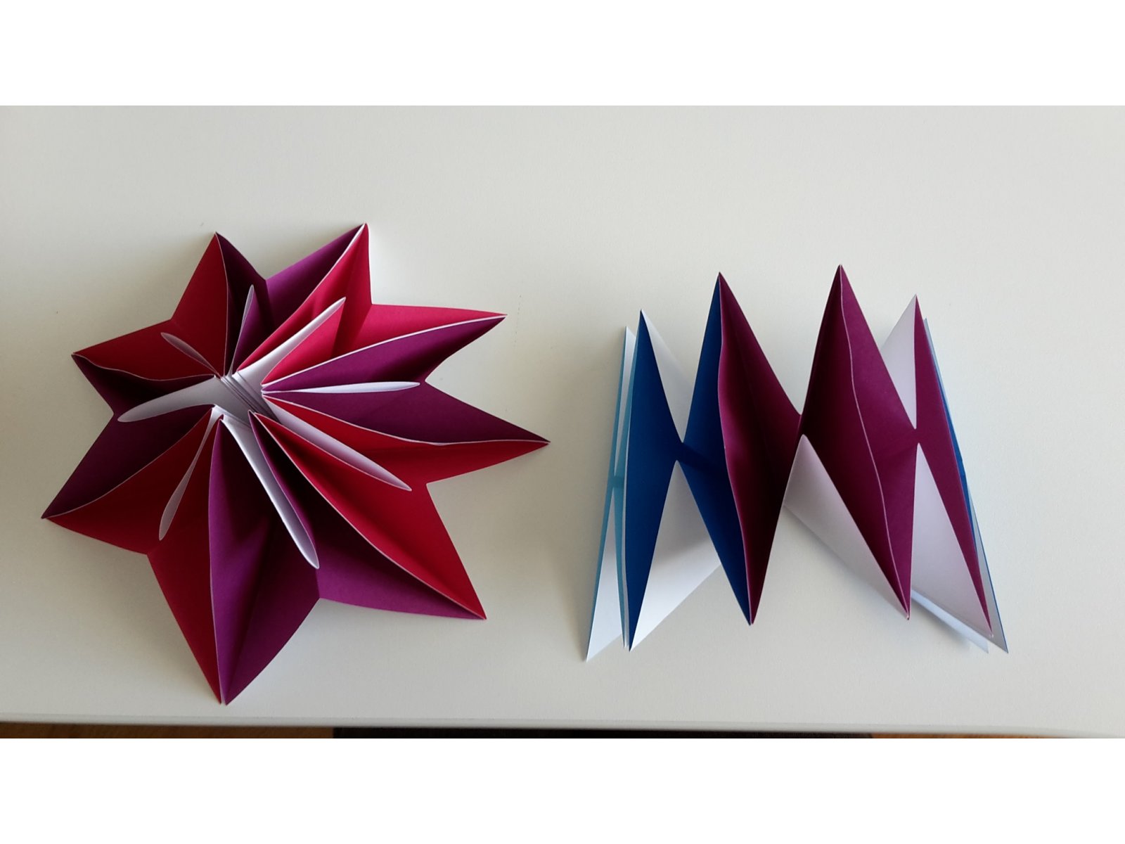 Die Ergebnisse zeigen u.a. ein kleines, schwarzes Raumschiff und eine Blume, die sich flexibel bewegen lässt und die, je nachdem wie man sie haltet, auch ein Stern oder eine Krone sein kann. Dabei hat alles ganz harmlos mit einem Quadratpapier angefangen …