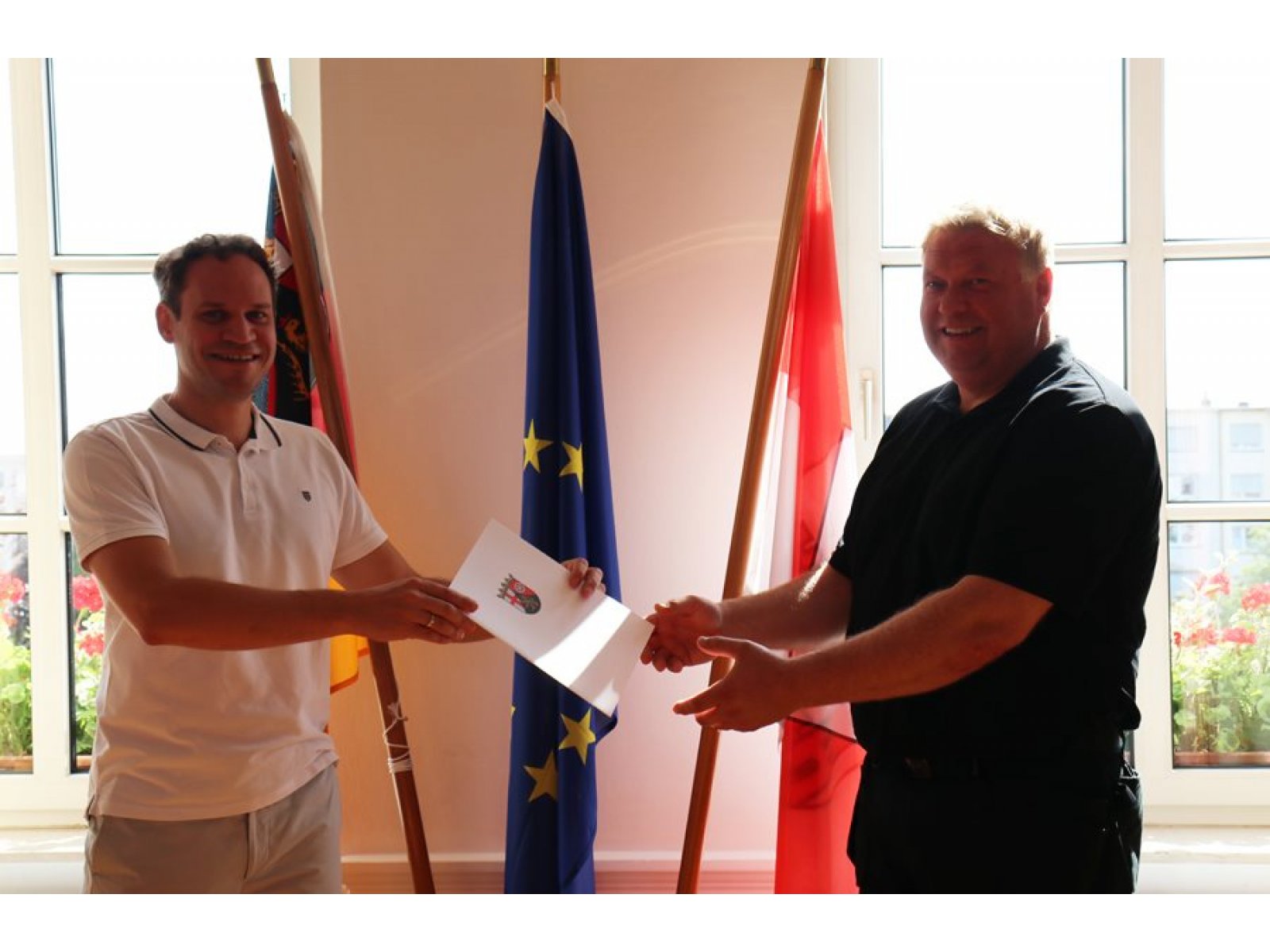 Im Rahmen seines Antrittsbesuchs gratuliert Beigeordneter Denis Clauer Herrn Zimmermann zu seiner offiziellen Bestellung.