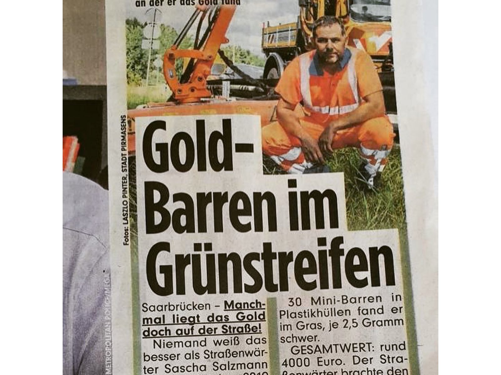 Der ehrliche Finder verständigte die Polizei und brachte das Gold ins Fundbüro! Mein Kollege Herr Eyrisch machte Detektivarbeit und fand den Hersteller der Barren im schweizerischen Tessin ausfindig. Wie sich herausstellte, ging das Gold auf dem Transport zu einem Kunden verloren. Wie es jedoch in den Pirmasenser Straßengraben gekommen war, bleibt ein Geheimnis!
