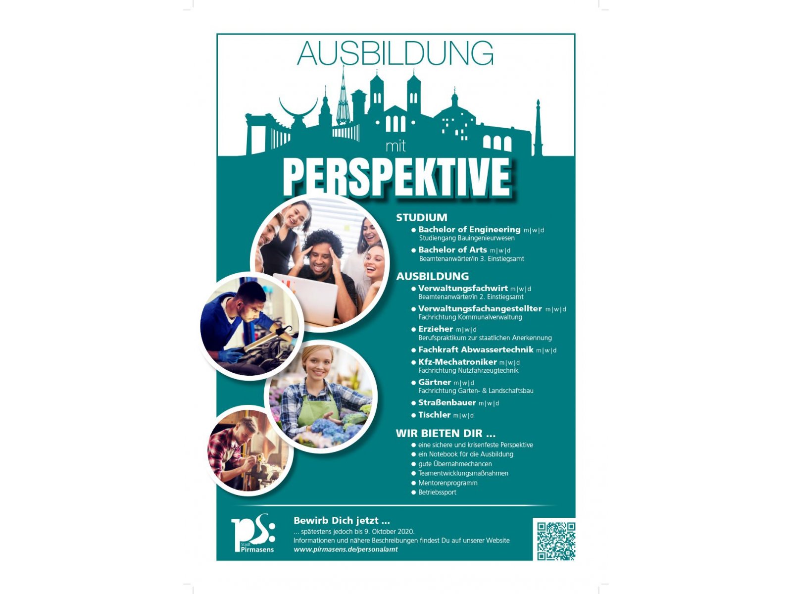 Der berufliche Einstieg im kommunalen Umfeld punktet in gleich mehrfacher Hinsicht. Dazu gehören in Pirmasens neben praxisnahen Ausbildungskonzepten in einem zukunfts- und krisensicheren Umfeld ganz konkret beste Aussichten für eine Übernahme in Festanstellung nach Ausbildungsende nebst attraktiven Karrierepfaden.