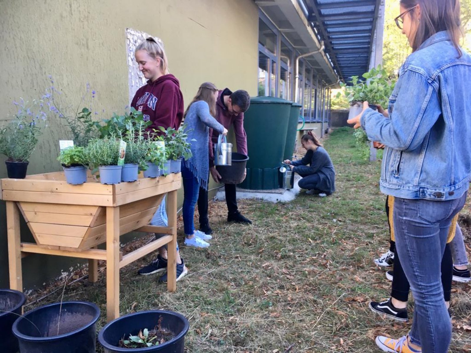 Dort haben die Schüler der Klasse 6c sich Gedanken um die Themen Nachhaltigkeit und Klimaschutz gemacht! Kurzerhand wurde beschlossen, den Schulgarten neu zu beleben! Und so hat die Klasse Hochbeete mit verschiedenen Heilkräutern angelegt!🌾