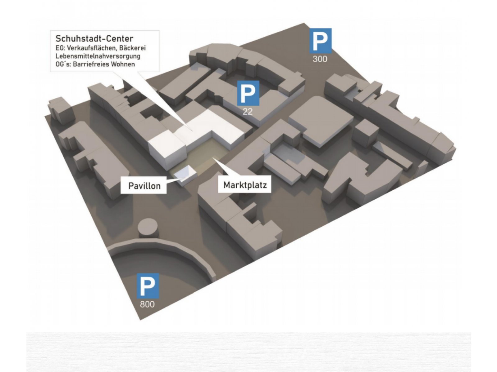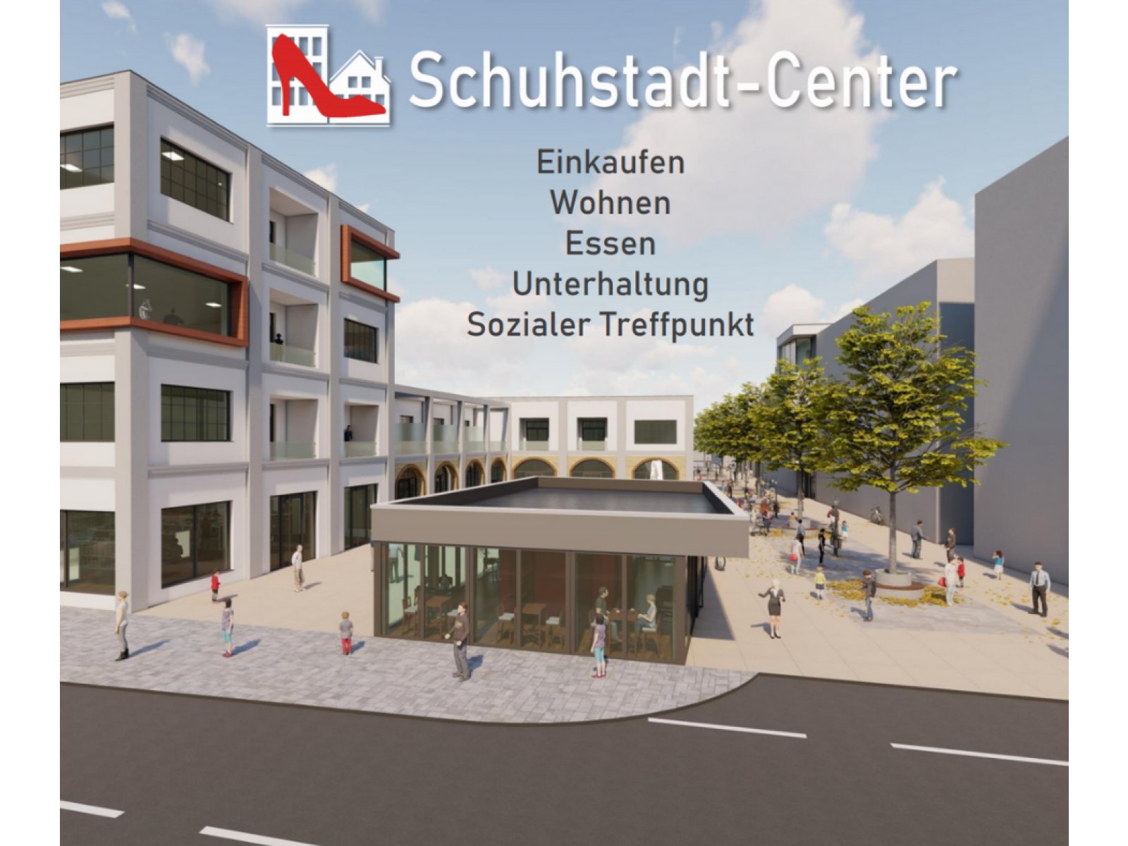 Anders als ursprünglich geplant, betrifft die neue Planung zunächst nur das bisherige „Kaufhallen“- Grundstück! Außerdem findet sich im „Schuhstadt- Center“ neben einem Schuhladen jetzt auch ein Angebot der Gastronomie und Nahversorgung sowie ein barrierefreies Wohnprojekt!