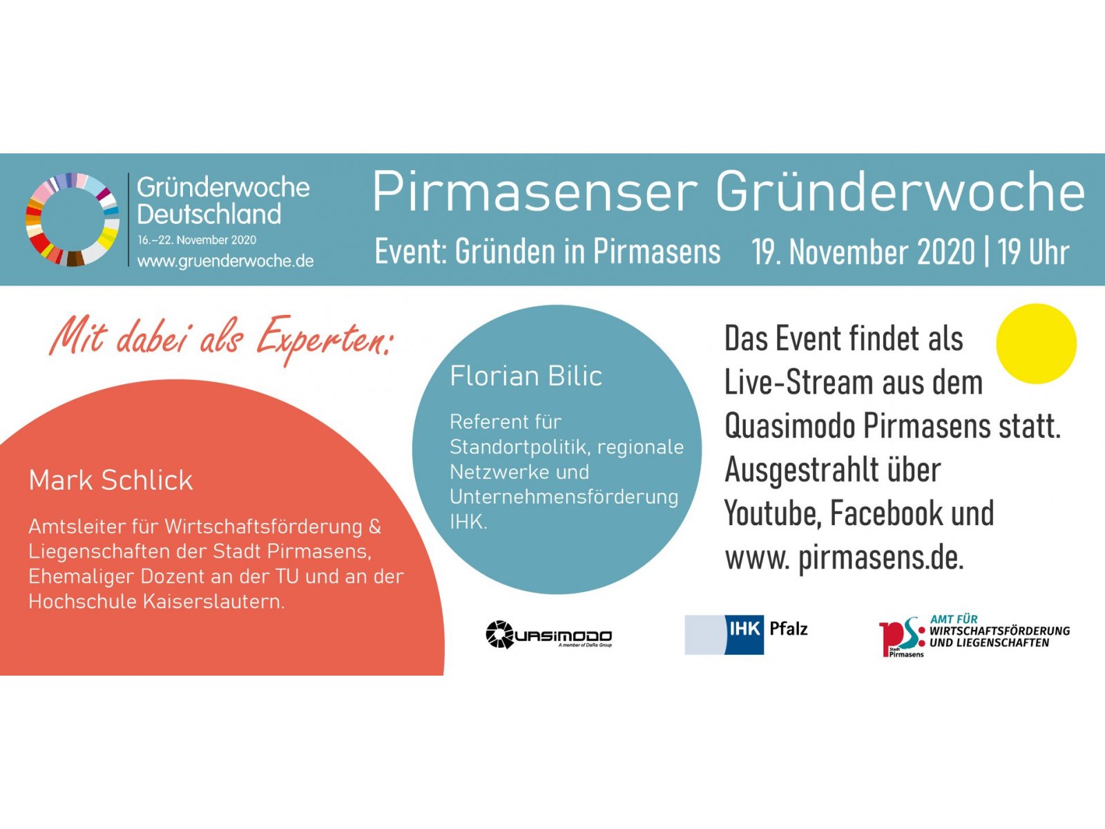 Im Rahmen der bundesweiten Aktionswoche veranstaltet das Amt für Wirtschafsförderung am 19. November 2020 eine Talkrunde unter dem Titel „Gründen in Pirmasens – Erfolgsgeschichte einer Mittelstadt“.🥳🤩