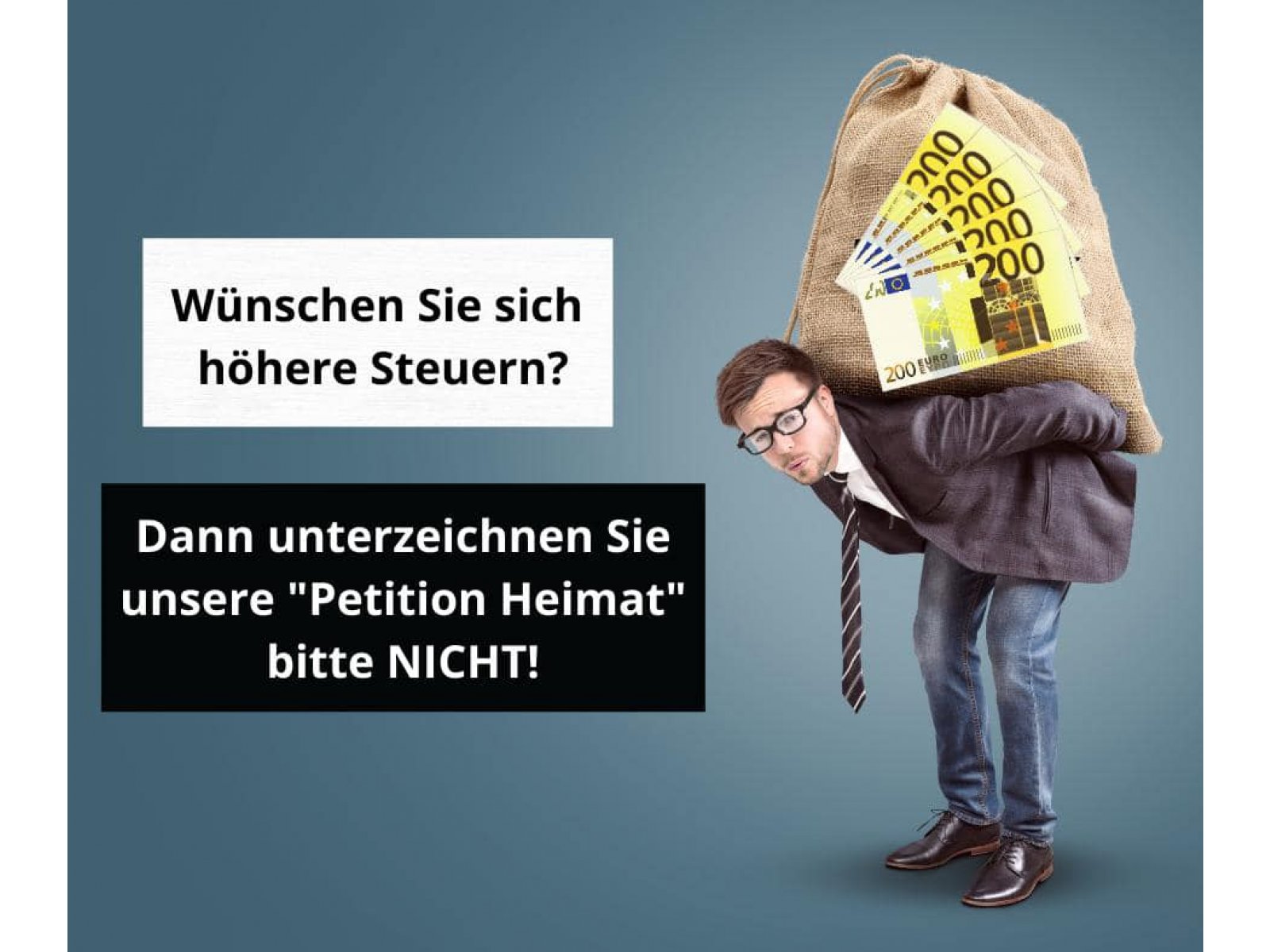 Wenn Sie also keine höhere Steuern bezahlen wollen, dann unterzeichnen Sie bitte unsere „Petition Heimat“ und setzen auch Sie ein Zeichen!