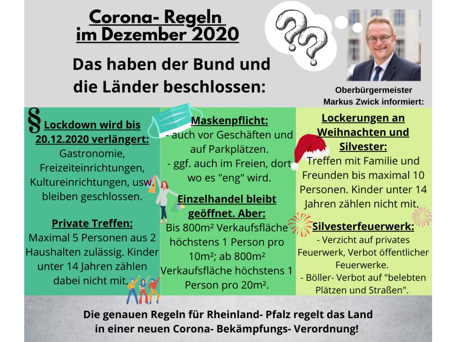 Einige der Entscheidungen sollen wir Städte und Landkreise wohl noch vor Ort treffen, z. B. ob ein Böllerverbot für öffentliche Plätze und Straßen verhängt wird. Oder ob in der Innenstadt auch im freien eine Maskenpflicht eingeführt werden soll. 😷